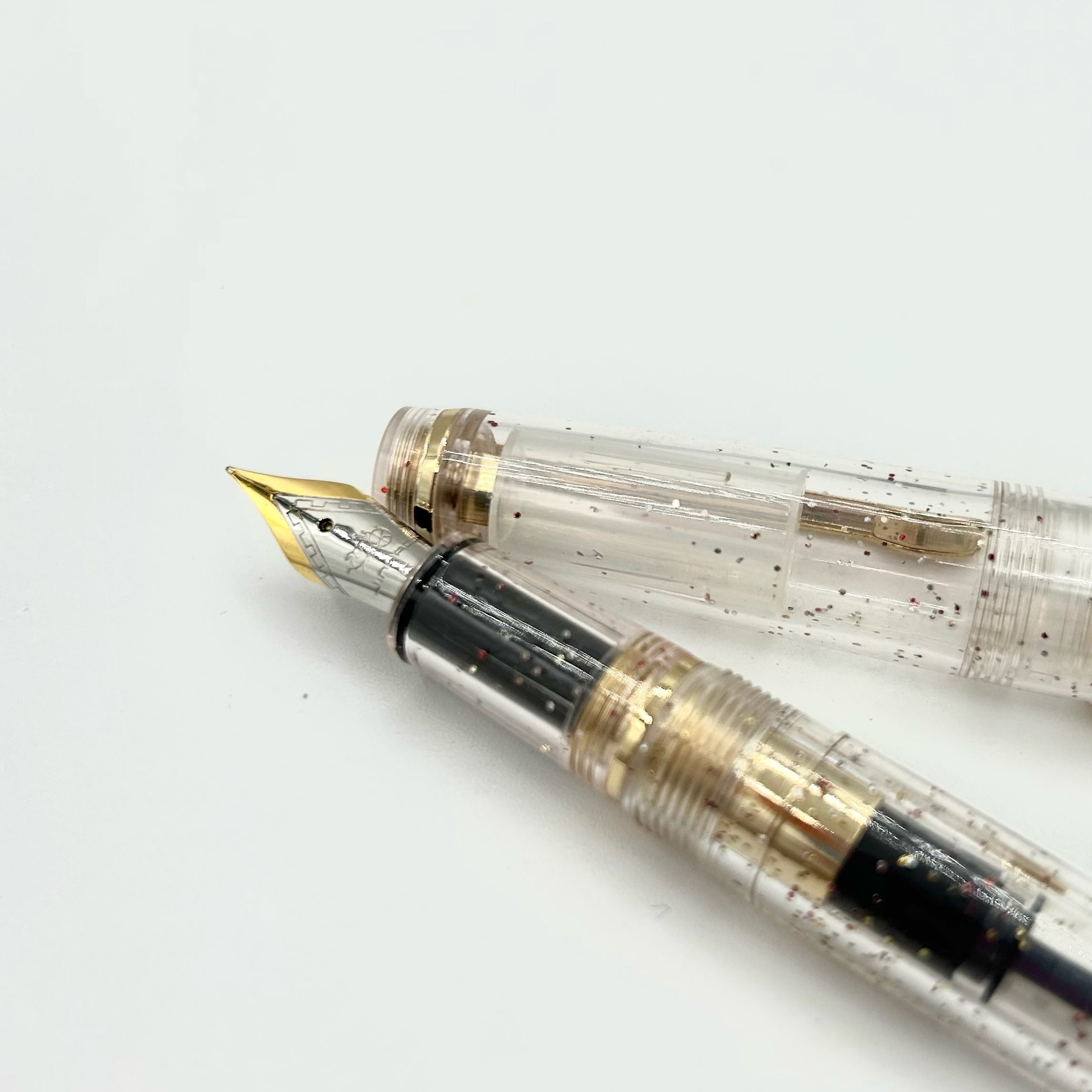 For the pale blue version of Jinhao 82, I use Pelikan 4001 Blue-Black with a few drops of the glitter potion from the brand Wearingeul. It works like magic I must be honest. For the transparent glitter one, I am using Pelikan Edelstein in Golden Beryl, a perfect glittery gold that looks like ambrosia!